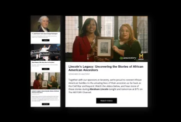 Leading up to the premiere of the Lincoln mega-documentary, The HISTORY Channel partnered with Ancestry to create a custom branded, three-episode miniseries that tells the uniquely personal stories of formerly enslaved African Americans and their connection to our 16th President, Abraham Lincoln, through conversations with their descendants. The creative illuminates unique perspectives, celebrates African American stories and highlights the importance and impact of learning about one's past.