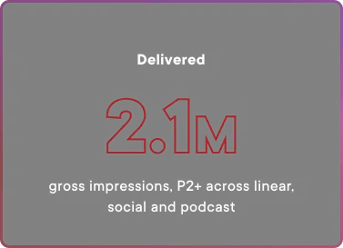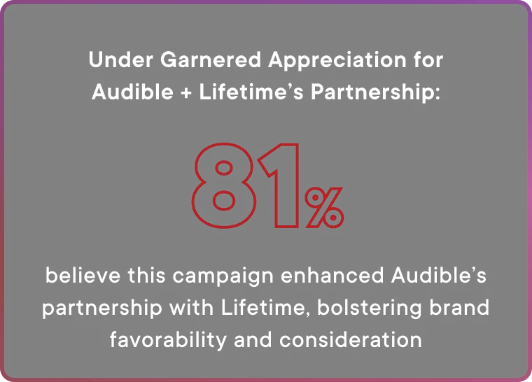 In this custom sponsorship, Audible and Lifetime teamed up to spread holiday romance and cheer. Audible reached Lifetime’s engaged movie audience with virtual integrations in two holiday films, Maps and Mistletoe and Holiday in Santa Fe, digitally adding Audible signage into the scenes. The campaign kicked off with tagged tune-ins for the It’s a Wonderful Lifetime catalog of movies. Maps and Mistletoe opened with a branded curtain raiser and utilized lower-third IPMs to integrate Audible’s messaging throughout the film. Audible’s messaging was amplified with custom content across Lifetime’s social channels and branded host reads during holiday-themed episodes of the I Love a Lifetime Movie podcast.